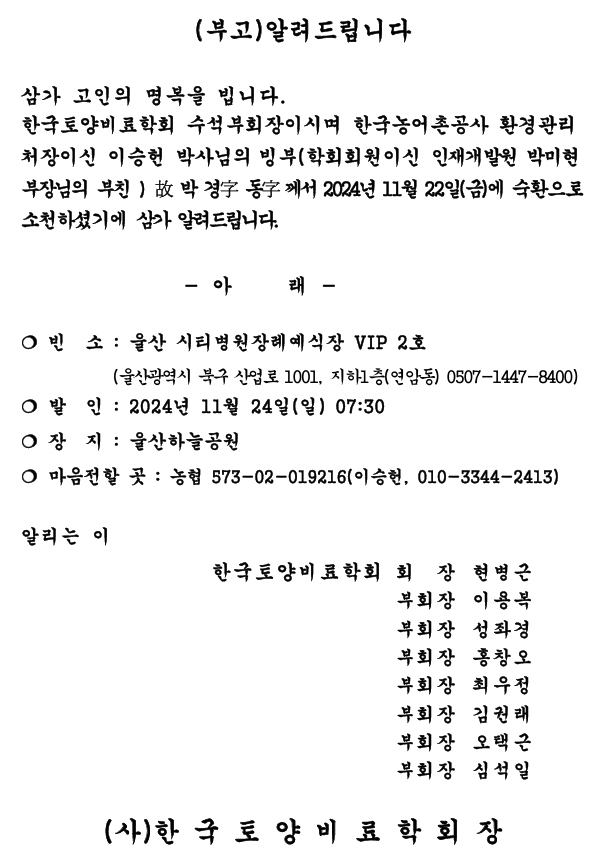 [알려드립니다](부고)한국토양비료학회 수석부회장이시며 한국농어촌공사 환경관리처장이신 이승헌 부회장님 빙부상 안내